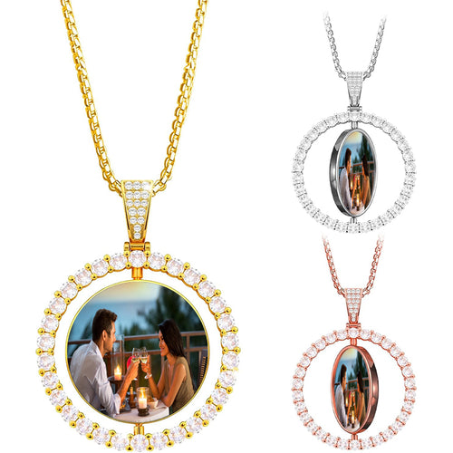 Custom Photo Large Circle Bling Necklace, Personalized Round Photo Pendant, Iced Out CZ Hip Hop Jewelry Gift for Men Women, Free Engraved